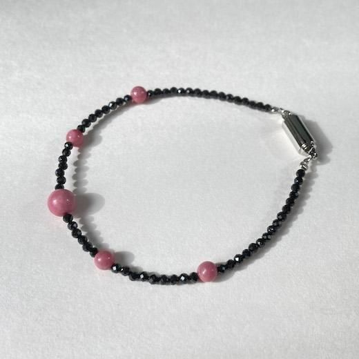 柔らかなピンク色のロードナイトとブラックスピネルでブレスレットを仕立てました。