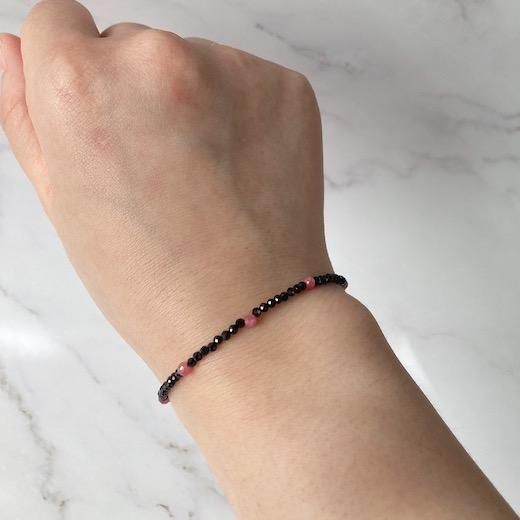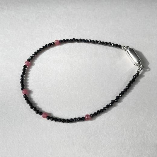 柔らかなピンク色のロードナイトとブラックスピネルでブレスレットを仕立てました。